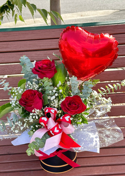 Valentines rose hat box 3 stems with balloon